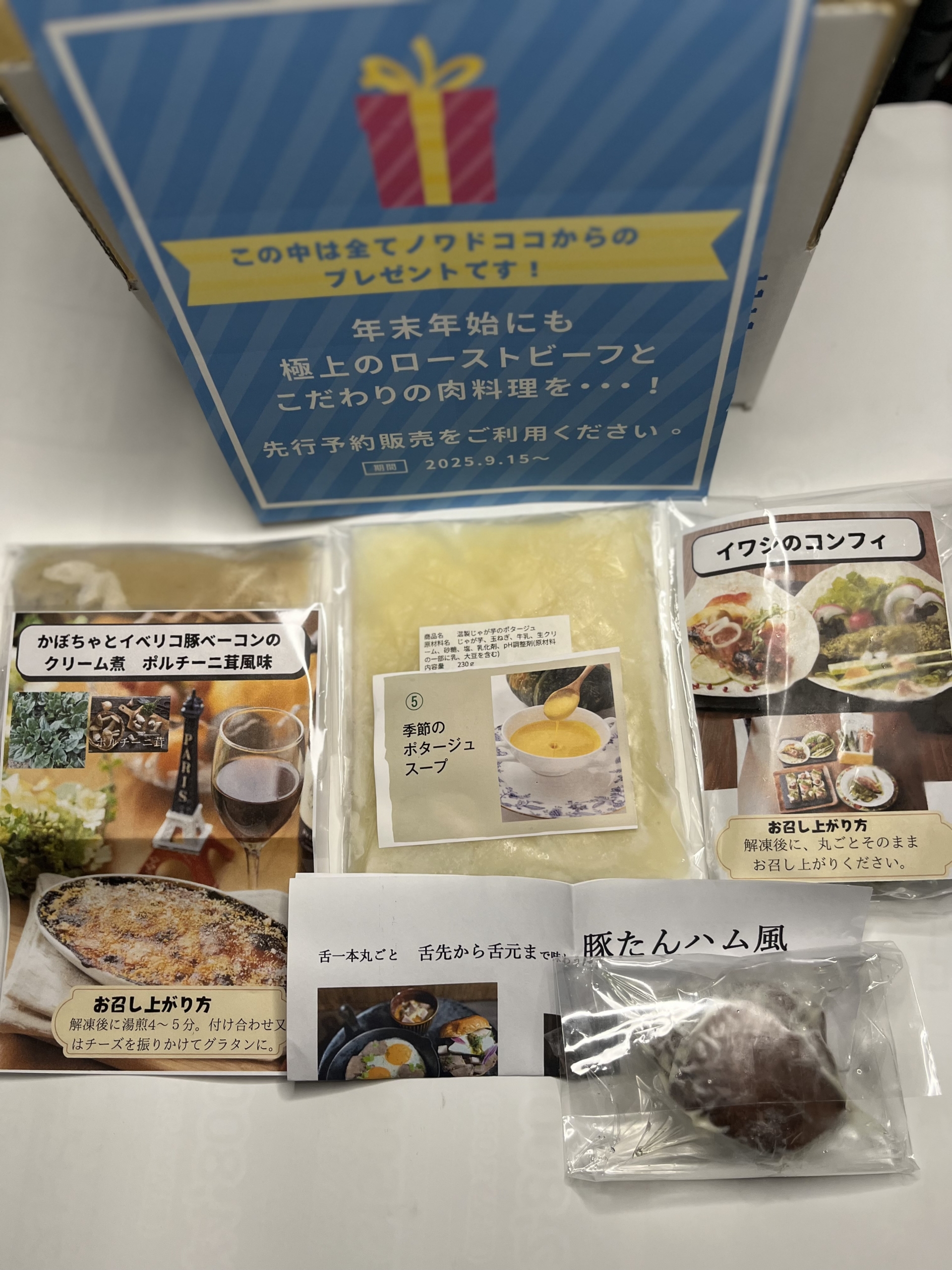 ホームパーティーをノワドココ商品で楽しんでいただけるぐらい、沢山のプレゼントをローストビーフに同梱してお送りします。